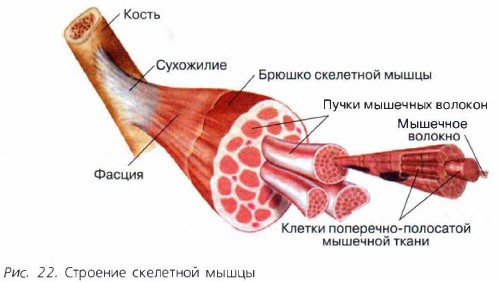Мышцы, соединённые с костями скелета, называют поперечно-полосатыми или скелетной мускулатурой. Они выполняют в организме целый ряд функций: передвижение человека и частей его тела в пространстве, поддержание позы, дыхательные движения, жевание и глотание, артикуляция и мимика, защита внутренних органов. 62 В теле человека различные исследователи насчитывают от 400 до 600 мышц. По массе они составляют от 35 до 50% у тренированных спортсменов. Строение скелетных мышцСтруктурной основой скелетных мышц является поперечио-полосатая мышечная ткань 12, которая состоит из многоядерных клеток, имеющих вид поперечно исчерченных волокон, способных к изменению своей длины, то есть к сокращению. Именно эта ткань образует часть мышцы, называемую брюшко (рис. 22). Волокна собраны в пучки, каждый пучок покрыт оболочкой из соединительной ткани. Пучки, в свою очередь, собраны в скелетную мышцу и тоже покрыты общей соединительно-тканной оболочкой — фасцией. На концах мышц эта оболочка утолщается и превращается в сухожилия, которые прикрепляют мышцу к специальным шероховатостям, бугоркам и выростам на костях (см. рис. 22).