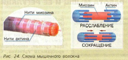 Группы скелетных мышцМышцы тела человека подразделяют в соответствии с их расположением в организме (рис. 23). Мышцы головы и шеи. Мышцы головы по функциям делят на жевательные и мимические. Жевательные мышцы одним концом прикреплены к костям черепа, а другим — к нижней челюсти. Из их названия ясно, что они необходимы для механического измельчения и перемешивания пищи, то есть для её пережёвывания. Мимические мышцы одним концом прикреплены к лицевой части черепа, а другим — к внутренней поверхности кожи лица. Круговые мышцы рта и глаз вообще не прикреплены к костям. Таким образом, они являются исключением среди мышц скелета, обычно прикреплённых к костям с обеих сторон. Мимические мышцы осуществляют открывание и закрывание глаз, придают лицу определённое выражение, а также служат для произнесения некоторых звуков. Для человека, который постоянно общается с другими людьми, мимические мышцы очень важны. Все мы знаем, что иногда выражение лица говорит больше, чем любые слова. Мышцы шеи нужны для движения не только самой шеи, но и головы, а также нижней челюсти. Мышцы спины осуществляют движения головы, шеи, лопаток. Они могут приподнимать и опускать руки. Кроме того, мышцы спины необходимы для поддержания вертикального положения тела. Одна группа мышц груди присоединена к костям плечевого пояса и рук и участвует в их движении. Другая группа называется межрёберными мышцами. Именно эти мышцы поднимают и опускают рёбра при внешнем дыхании. Мышцы живота. Передние и боковые стенки живота образованы мышцами, которые называются брюшным прессом. Их так назвали потому, что при совместном сокращении они надавливают на внутренние органы, располагающиеся в брюшной полости. Мышцы живота необходимы для поворотов туловища в стороны и наклонов. Они участвуют в дыхательных движениях, а также во многих других процессах жизнедеятельности. При этом брюшной пресс выполняет не только двигательную, но и защитную функцию. К мышцам живота относят также диафрагму, которая герметично разделяет полость тела человека на грудную и брюшную полости. Основная функция диафрагмы — участие в дыхательных движениях. Мышцы плечевого пояса и руки обеспечивают сложнейшие перемещения руки и её отделов. 62-63 Мышцы тазового пояса и ноги. Тазовые мышцы обеспечивают движение бедра, мышцы бедра участвуют в движении бедра и голени. Мышцы голени необходимы для движения стопы, и, наконец, мышцы стопы сгибают и разгибают пальцы ног. 62-63 Моя лабораторияМышечные ткани образованы клетками, обладающими свойствами возбудимости и сократимости. Возбудимость — это способность клеток отвечать на внешние раздражители, а сократимость — способность клеток этих тканей менять свои размеры под действием этих самых раздражителей. Дело в том, что в состав мышечных тканей входят особые сократительные белки — актин и миозин, которые, взаимодействуя между собой, уменьшают длину мышечных клеток, и вся мышца сокращается (рис. 24).