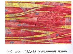 Эти мышцы образованы гладкой мышечной тканью (рис. 26) и входят в состав стенок внутренних органов: желудка, кишечника, матки, мочевого пузыря и др., а также большинства кровеносных сосудов. Гладкие мышцы сокращаются медленно — в течение десятков секунд. Но благодаря этому тратится меньше энергии, образуется меньше продуктов обмена. Гладкие мышцы могут находиться в состоянии сокращения очень долго, а утомление в них практически не развивается. Например, мышцы стенок артерий человека находятся в сокращённом состоянии всю жизнь. Гладкие мышцы сокращаются только непроизвольно, то есть мы не можем сокращать их по своей воле. Моя лабораторияОсновным веществом, в виде которого в наших клетках запасается и сохраняется энергия, является АТФ (аденозинтрифосфорная кислота). Это вещество, распадаясь, выделяет энергию, которая нужна для того, чтобы мышечные волокна смогли сокращаться. Сокращение мышечных волокон обеспечивают особые сократимые белки — актин и миозин, которые содержатся в мышечных клетках. Мышцы сокращаются, используя химическую энергию, но при этом бо́льшая часть энергии (около 67%) расходуется на тепло. Можно было бы подумать, что это плохо, так как энергия расходуется не на полезную работу. Однако это не так: тепло равномерно нагревает человеческий организм, поддерживая в нём постоянную температуру 37 °С. Вот почему, замерзая, человек старается активно двигаться, прыгать, бегать — при этом выделяется больше тепла. Кроме того, когда человек замерзает, его мышцы начинают сокращаться независимо от его желания, то есть возникает дрожь и продукция тепла возрастает. У людей, чьи мышцы плохо тренированы, кровоток не успевает освободить их от молочной кислоты, которая вызывает довольно сильную боль в мышцах на следующий после физической нагрузки день. Для того чтобы мышцы быстрее перестали болеть, нужно сделать несколько лёгких физических упражнений. Это приведёт к усилению кровотока в мышцах, и вредные вещества из них будут вскоре удалены.