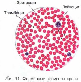 Кровь на 55—60% состоит из плазмы и на 40—45% — из форменных элементов (рис. 30). Плазма — это жидкая часть крови, её межклеточное вещество. Она на 90% состоит из воды, а также включает в себя целый ряд веществ: белки, жиры, сахара, минеральные соли. Часть этих веществ — питательные вещества, переносимые кровью к различным органам. У белков плазмы крови многообразные функции. Одни из них участвуют в свёртывании крови, другие отвечают за связывание болезнетворных микроорганизмов или чужеродных белков, проникших в кровь извне. Форменные элементы кровиК форменным элементам крови относятся эритроциты, лейкоциты и тромбоциты (рис. 31). Эритроциты, или красные кровяные тельца, — маленькие дисковидные клетки, теряющие во время созревания своё ядро. В 1 мм3 крови человека содержится примерно 5,5 млн эритроцитов. Функция эритроцитов — доставка к тканям кислорода и удаление углекислого газа, то есть эритроциты обеспечивают дыхательную функцию крови. Внутри эритроцитов находятся молекулы ярко-красного дыхательного пигмента — гемоглобина, по 270 млн молекул в каждой клетке! Именно присутствие в эритроцитах гемоглобина делает кровь красной.