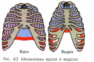 Механизм дыханияДыхательные движения обеспечивают вдохи и выдохи, то есть попеременные увеличения и уменьшения объёма лёгких. При вдохе межрёберные мышцы, сокращаясь, поднимают рёбра, а диафрагма отодвигается в сторону брюшной полости, становясь менее выпуклой. В результате этого объём грудной полости увеличивается (рис. 43). Так как давление в грудной полости ниже атмосферного, то при увеличении её объёма растягиваются и лёгкие. Давление в них на какой-то момент также становится ниже атмосферного, и в лёгкие по дыхательным путям устремляется воздух из окружающей среды.
