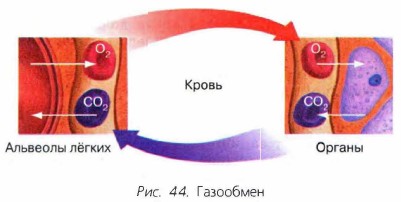 В альвеолах кислород переходит из альвеолярного воздуха в кровь, а углекислый газ — из крови в альвеолярный воздух (рис. 44). Это происходит благодаря тому, что кровь, поступающая в лёгкие по сосудам малого круга кровообращения из правого желудочка сердца, содержит много углекислого газа. В лёгких углекислый газ переходит из кровеносных сосудов в альвеолы и выдыхается в окружающую среду. 44 Кислород из воздуха, заполняющего альвеолы при вдохе, наоборот, переходит в кровь, находящуюся в капиллярах малого круга. В крови кислород связывается гемоглобином эритроцитов, и кровь, ставшая теперь артериальной, устремляется по сосудам к сердцу.
