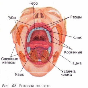 Ротовая полость — начальный отдел пищеварительной системы, в который попадает пища. Она ограничена сверху нёбом, с боков — щеками, снизу — челюстно-подъязычной мышцей, а спереди — губами. В ней расположены органы: зубы и язык (рис. 48). В ротовую полость открываются протоки трёх пар крупных и множества мелких слюнных желёз 48, вырабатывающих особый секрет - слюну. Рассмотрим особенности строения названных органов и их вклад в процессы механической и химической обработки пищи в ходе пищеварения.