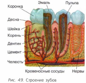 Губы представляют собой подвижные кожные складки, между которыми заключена круговая мышца рта и мелкие мимические мышцы. Они пронизаны большим количеством кровеносных сосудов и нервных окончаний, что придаёт им чувствительность, имеющую огромное значение в процессе анализа состояния пищи. Как вам известно, у всех млекопитающих животных губы имеют особое значение в связи с приспособлением детёнышей к сосанию молока, а у взрослых особей к активному захватыванию пищи. Человек также не является исключением. Зубы представляют собой твёрдые костеподобные образования, расположенные в углублениях верхних и нижних челюстей. Они необходимы для механического измельчения пищи в процессе пережёвывания. У каждого зуба есть две части — коронка и корень (рис. 49). Коронка располагается над десной, а корни удерживают зуб в лунках костей челюсти. В зависимости от разновидности зуб может иметь от одного до трёх корней. Основная масса зуба состоит из твёрдого, костеподобного вещества — дентина. Он пронизан мельчайшими канальцами, в которых находятся питающие волокна и нервные окончания. Дентин коронки зуба покрыт защитным слоем эмали — тканью, лишённой клеток. Эмаль — самое твёрдое вещество в нашем организме. Корень зуба покрыт слоем цемента — особого вещества, необходимого для удержания зуба в его лунке. В толще дентина каждого зуба есть полость, заполненная мягким содержимым — пульпой. Через узкое отверстие в корне зуба в неё проходят нервы и кровеносные сосуды из костей челюсти. Десна состоит из эпителиальной ткани, плотно соединённой волокнами с костями челюсти, образуя защиту вокруг шейки зуба.