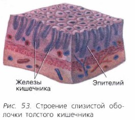 Вода и растворённые в ней соли могут всасываться на протяжении всего желудочно-кишечного тракта: в ротовой полости, желудке, тонком и толстом кишечнике. Однако подавляющее большинство пищевых веществ всасывается через стенки тонкого кишечника, а именно тощей и подвздошной кишками. Эпителий кишечника образует ворсинки, внутри которых имеются разветвления кровеносных капилляров, а также начинаются лимфатические слепо замкнутые капилляры (рис. 51). Ворсинки увеличивают общую всасывающую поверхность соответствующих органов. Например, общая поверхность ворсинок в кишечнике достигает 200 м2. Продукты переваривания белков и углеводов всасываются непосредственно в кровь, попадая через ворсинки в кровеносные капилляры, а вот продукты переваривания жиров всасываются в лимфатические капилляры. Барьерная роль печениВсосавшиеся через стенки кишечника питательные вещества с током крови прежде всего попадают в печень. В клетках печени вредные для здоровья вещества, случайно или преднамеренно попавшие в кишечник, разрушаются. При этом прошедшая через капилляры печени кровь почти не содержит ядовитых для человека химических соединений. Эта функция печени получила название барьерной. Например, клетки печени способны разрушать такие яды, как стрихнин и никотин, а также алкоголь. Однако многие вещества наносят печени вред, приводя её клетки к гибели. Печень — один из немногих органов человека, способных к самовосстановлению (регенерации), поэтому некоторое время она может выносить злоупотребления табаком и алкоголем, но до определённого предела, за которым следует разрушение её клеток — цирроз печени и смерть. Печень также является хранилищем глюкозы — самого главного источника энергии для всего организма, и особенно мозга. В печени часть глюкозы превращается в сложный углевод — гликоген. В виде гликогена запас глюкозы хранится до тех пор, пока её уровень в плазме крови не понизится. Если это происходит, гликоген снова превращается в глюкозу и поступает в кровь для доставки ко всем тканям, а главное — к мозгу. Толстый кишечник и его роль в питанииИз тонкого кишечника непереваренные и невсосавшиеся пищевые массы переходят в толстый кишечник (рис. 52). Он имеет длину около 2 м и включает в себя три отдела: слепую, ободочную и прямую кишки. Между тонким и толстым кишечником находится специальный клапан, пропускающий пищевые массы порциями и только в одном направлении. Железы стенок толстого кишечника (рис. 53) ферментов не вырабатывают, но выделяют слизь, необходимую для формирования каловых масс — кала.