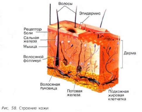 Они постоянно слущиваются, и их место занимают клетки нижних слоёв. В среднем за один год жизни человек теряет до 700 г кожных частичек. Дерма, или собственно кожа, состоит из соединительной ткани. В дерме находится большое число гладкомышечных волокон, а также переплетённые волокна белков — коллагена и эластина. Благодаря этому кожа человека пластична и упруга. В дерме также расположены тысячи мельчайших кровеносных сосудов. Кровь, текущая по этим сосудам, снабжает кожу питательными веществами, кислородом и уносит продукты обмена. В случае повреждения кожи быстро образуется сгусток крови, покрывающий рану и защищающий организм от попадания в него инфекционных агентов. В дерме расположены многочисленные нервные окончания — рецепторы, позволяющие ощущать прикосновения, тепло, холод, боль. В ней же на границе с подкожной клетчаткой располагается около 3 млн потовых желёз. Больше всего их на ладонях, в подмышечных и паховых складках. Потовые железы представляют собой длинные неразветвлённые трубочки, начальный конец которых скручен в клубочек. По составу пот близок к моче. Количество пота, выделяемого человеком, сильно колеблется, достигая в жаркие дни 3 л в сутки. Потовые железы не только выполняют выделительную функцию, но и играют важнейшую роль в поддержании постоянной температуры тела человека. Под дермой расположена подкожная жировая клетчатка. Она образована рыхлой соединительной тканью и может содержать значительные жировые отложения. Толщина её варьируется на различных участках тела человека, достигая наибольшей величины на бёдрах и животе. Запасаемый жир не только защищает организм от переохлаждения, но и является резервом на случай больших энергетических затрат. Производные кожиВолосы и ногти состоят в основном из белка кератина. Этот же белок входит в состав шерсти, рогов и копыт животных. Сами по себе и волосы, и ногти лишены болевой чувствительности, но если за них сильно потянуть, то болевые рецепторы кожи среагируют и боль может быть довольно сильной. Волосы развиваются из корней, которые располагаются на дне особых впадин в коже — волосяных сумок, или волосяных фолликул (см. рис. 58). Фолликулы содержат сальные железы, выделяющие микроскопическое количество кожного сала, необходимого для смазывания волос и кожи. В каждом фолликуле есть очень маленькая мышца, способная приподнимать волос. Если человеку холодно или он испытывает сильные эмоции (например, сильный испуг), то эти рудименты мышц сокращаются, волоски и кожа вокруг них приподнимаются. Образуется так называемая гусиная кожа. В среднем у каждого человека на голове находится около 100 тыс. волос. Ногти также ороговевшие кожные образования. Нижнюю часть ногтя, которая погружена в кожу, называют корнем, а видимую часть — телом ногтя. Ногти выполняют защитную функцию, прикрывая самые чувствительные части наших пальцев. На руках ногти растут гораздо быстрее, чем на ногах. К производным кожи относятся и молочные железы. Каждая из двух желёз состоит из 15—20 видоизменённых потовых желёз, развившихся в дольки. У мужчин они остаются недоразвитыми, а у женщин формируют молочные железы в период полового созревания. Во время беременности эти железы увеличиваются, для того чтобы обеспечить новорождённого самой ценной пищей на земле. Функции кожиКожа, выполня