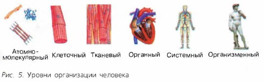 Уровни организации человекаВсе живые и неживые объекты на Земле состоят из мельчайших частиц — атомов. Атомы объединяются в молекулы, из которых, в свою очередь, построены клетки. Клетки, которые вместе выполняют какие-либо функции в организме (например, обеспечивают движение), являются основой ткани. Ткани образуют органы, которые объединяются в системы органов. Например, мышечная ткань образует скелетные мышцы, которые входят в состав опорно-двигательной системы. А уж все вместе системы органов составляют целый организм. Таким образом, говоря о строении организма человека, можно выделить следующие уровни организации: атомно-молекулярный, клеточный, тканевый, органный, системный (уровень систем органов) и организменный (рис. 5).
