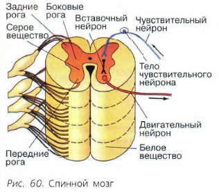 Спинной мозг расположен в позвоночном канале и представляет собой тяж длиной 43—45 см и массой около 30 г. 17 Наверху спинной мозг переходит в нижний отдел головного мозга — продолговатый мозг, а внизу заканчивается на уровне поясничных позвонков. Спинной мозг омывается спинномозговой жидкостью, которая защищает его от толчков. Двумя продольными бороздами — передней и задней — спинной мозг делится на две симметричные половины. На поперечном срезе хорошо видно, что в центре спинного мозга вокруг спинномозгового канала расположены тела нейронов, образующие серое вещество спинного мозга (рис. 60). Вокруг серого вещества расположены отростки нервных клеток самого спинного мозга, а также приходящие в спинной мозг аксоны нейронов головного мозга и периферических нервных узлов, которые и образуют белое вещество спинного мозга.