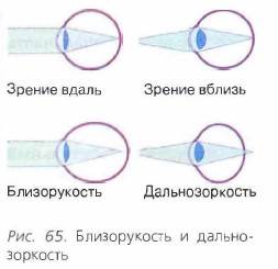 Одной из главных проблем людей старше 40 лет является нарушение зрения. В России 60% населения имеют проблемы со зрением; более 1 млн — слепые и слабовидящие. Снижение зрения означает утрату возможности читать, писать, смотреть телевизор и др. Среди основных расстройств зрения следует отметить близорукость и дальнозоркость. При близорукости (рис. 65) глазное яблоко несколько вытягивается и изображение от отдалённых объектов не фокусируется на сетчатке, оказываясь как бы перед ней. При дальнозоркости (см. рис. 65) картина будет противоположной, но в обоих случаях изображение на сетчатке будет нечётким. Близорукие люди плохо видят удалённые предметы, хорошо различая всё, что расположено рядом. Дальнозоркие люди, наоборот, хорошо видят на далёкие расстояния, но чтение книги, лежащей перед ними, вызывает у них затруднение. В обоих случаях поправить положение могут правильно подобранные очки. Для того чтобы человек хорошо видел, необходимо сфокусировать оба глаза на объекте. За счёт этого формируется объёмное зрение, оценивается форма предмета и расстояние до него. Ещё одним нарушением зрения является косоглазие. При косоглазии глаза как будто пытаются сойтись вместе или, наоборот, разойтись. Косоглазие может или быть врождённым, или возникнуть из-за травмы. Лечат это заболевание специальными упражнениями, ношением особых очков, но иногда приходится прибегать к операции. Помутнение хрусталика довольно часто встречается у пожилых людей и диабетиков. Это заболевание называется катарактой. Иногда катаракта у ребёнка бывает врождённой, чаще всего в том случае, если его будущая мама переболела краснухой на ранней стадии беременности. Однако такой непрозрачный хрусталик можно удалить и заменить его специальными очками, выполняющими функцию хрусталика. Для глаз очень опасны различные повреждения, вызываемые острыми предметами или химическими и температурными ожогами. При повреждениях глаз оказать грамотную помощь без участия специалиста трудно, а потому следует наложить на глаз повязку и срочно доставить больного к врачу. Так как глаза могут пострадать от целого ряда инфекций, следует тщательно следить за их гигиеной, а при покраснении глаз и возникновении неприятных ощущений обращаться к врачу. Новые понятия Анализатор. Глаз. Слепое пятно. Близорукость. Дальнозоркость. Косоглазие. Катаракта Ответьте на вопросы 1. Что такое анализаторы и какие части входят в их состав? 2. Каково строение зрительного анализатора? 3. Где расположены рецепторы, воспринимающие зрительную информацию? Какие их виды различают и каковы их функции? 4. Какие расстройства зрения вам известны и каковы их основные причины? Выполните задание 1. Раскройте механизм работы зрительного анализатора. 2. Сформулируйте основные правила гигиены зрения. ПОДУМАЙТЕ! Почему в сумерки мы не можем различить окраску предметов?