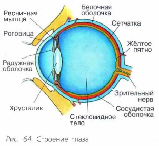 Строение глаза (рис. 64). Орган зрения — глаз — состоит из глазного яблока и вспомогательного аппарата. К последнему относят веки, ресницы, мышцы глазного яблока и слёзные железы. Веки — складки кожи, выстланные изнутри слизистой оболочкой. Слёзы, образующиеся в слёзных железах, омывают передний отдел глазного яблока и через носослёзный канал проходят в ротовую полость. У взрослого человека в сутки должно вырабатываться не менее 3—5 мл слёз, которые увлажняют поверхность глазного яблока, очищая его от пылинок и убивая бактерий. 70 Глазное яблоко имеет шарообразную форму и располагается в глазнице. При помощи глазодвигательных мышц оно может поворачиваться в глазнице. Глазное яблоко имеет три оболочки. Наружная оболочка (белочная) спереди глазного яблока переходит в прозрачную роговицу, её задний отдел называется склерой. Через среднюю оболочку (сосудистую) глазное яблоко снабжается кровью. Впереди в сосудистой оболочке имеется отверстие — зрачок, позволяющий лучам попадать внутрь глазного яблока. Вокруг зрачка часть сосудистой оболочки окрашена и называется радужкой. Клетки радужки содержат всего один пигмент, и, если его мало, радужка окрашена в голубой или серый цвет, а если много — в карий или чёрный. Мышцы зрачка сужают или расширяют его (от 2 до 8 мм в диаметре) в зависимости от яркости света, освещающего глаз. Между роговицей и радужкой расположена передняя камера глаза, заполненная жидкостью. Позади радужки расположен прозрачный хрусталик — двояковыпуклая линза, необходимая для фокусировки лучей света на внутренней поверхности глазного яблока. Хрусталик снабжён специальными мышцами, меняющими его кривизну. Процесс изменения кривизны хрусталика называют аккомодацией. Между радужкой и хрусталиком расположена задняя -камера глаза. Большая часть глазного яблока заполнена прозрачным стекловидным телом. Механизм работы зрительного анализатораПройдя через хрусталик и стекловидное тело, лучи света попадают на внутреннюю оболочку глазного яблока — сетчатку. Это многослойное образование содержит зрительные рецепторы — колбочки (около 7 млн) и палочки (около 130 млн). В палочках содержится зрительный пигмент родопсин, они более чувствительны, чем колбочки, и обеспечивают чёрно-белое зрение при плохом освещении. Колбочки содержат зрительный пигмент иодопсин и обеспечивают цветное зрение в условиях хорошей освещённости. Считается, что есть три вида колбочек, воспринимающих красный, зелёный и фиолетовый цвета соответственно. Все остальные оттенки определяются комбинацией возбуждения в этих трёх типах рецепторов. Под действием квантов света зрительные пигменты разрушаются, генерируя электрические сигналы, которые передаются от палочек и колбочек к зрительному нерву, и по его волокнам импульсы поступают в мозг. В месте выхода зрительного нерва из сетчатки отсутствуют и колбочки, и палочки. Это место называется слепым пятном. Больше всего колбочек располагается прямо напротив зрачка — в жёлтом пятне, а в периферических отделах сетчатки колбочек почти нет, там располагаются одни палочки. Выйдя из глазного яблока, зрительный нерв следует в верхние бугры четверохолмия среднего мозга, где зрительная информация подвергается первичной обработке. По аксонам нейронов верхних бугров зрительная информация попадает в з