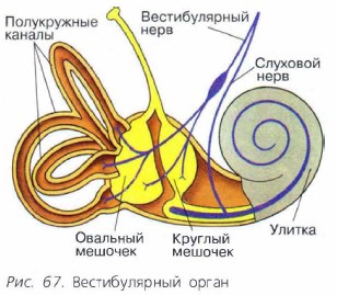 В преддверии внутреннего уха расположены круглый и овальный мешочки, которые заполнены жидкостью. В стенках мешочков находится большое количество рецепторных волосков клеток. В полости мешочков расположены отолиты — кристаллы солей кальция. Кроме того, в полости внутреннего уха присутствуют три полукружных канала, расположенные во взаимно перпендикулярных плоскостях. Они заполнены жидкостью, а в стенках их расширений находятся рецепторы (рис. 67). При изменении положения головы или всего тела в пространстве отолиты и жидкость полукружных канальцев перемещаются, возбуждая рецепторы. Их отростки образуют вестибулярный нерв, по которому информация об изменении положения тела в пространстве попадает в ядра среднего мозга, мозжечок, ядра таламуса и, наконец, в теменную область коры больших полушарий. Мышечное чувствоЧеловек прекрасно чувствует, в каком положении находятся части его тела, например конечности. Для этого в мышцах и особенно в их сухожилиях располагаются многочисленные рецепторы, передающие в мозг информацию о степени растяжения каждой мышцы, а значит, и о том, насколько эта мышца сокращена. Эта информация поступает в мозжечок и теменную область коры больших полушарий, что позволяет очень быстро и точно контролировать позу всего тела человека и положение его отдельных частей. Мышечное чувство позволяет человеку довести до автоматизма свои двигательные навыки. Например, акробат выполняет целые каскады сложнейших движений, совершенно не задумываясь об их последовательности. Это возможно только благодаря точной работе вестибулярного аппарата и хорошо тренированному мышечному чувству. ОсязаниеОсязание — это комплекс ощущений, возникающий при раздражении нескольких видов рецепторов кожи, реагирующих на холод, тепло, давление, прикосновение и т. д. Информация от всех этих рецепторов собирается в спинной мозг и по проводящим путям белого вещества поступает в ядра таламуса, а оттуда в высший центр тактильной чувствительности — область задней центральной извилины коры больших полушарий. Моя лабораторияМорская болезнь. Очень многих людей укачивает. Во время качки жидкость в полукружных каналах постоянно перемещается и возбуждает рецепторы, а мозговые центры реагируют на это неприятными ощущениями. Победить укачивание можно либо тренировкой, либо специальными лекарствами. К сожалению, некоторых людей укачивает несмотря на многолетнюю морскую Н практику. Известно, что великий английский адмирал Нельсон очень реагировал на небольшие волнения моря и на мостике его флагманского корабля рядом с ним всегда находилось ведро на случай рвоты. Новые понятия Вестибулярный анализатор. Мышечное чувство. Осязание Ответьте на вопросы 1. Каково строение вестибулярного анализатора? 2. Где расположены рецепторы, воспринимающие информацию о положении тела в пространстве? 3. Каково значение мышечного чувства для людей разных профессий? 4. Какие виды рецепторов кожи вам известны? Выполните задание 1. Охарактеризуйте особенности строения органа равновесия и функции его основных частей. 2. Раскройте механизм работы вестибулярного анализатора. ПОДУМАЙТЕ! Почему перед выполнением сложного действия человеку важно мысленно представить его во всех деталях и в нужной последовательности?