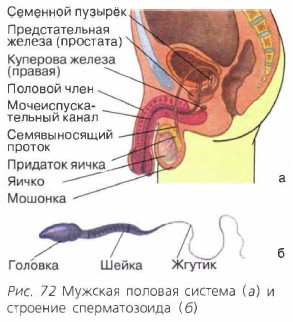 В состав мужской половой системы входят половые органы: внутренние (семенники, семявыносящие протоки, предстательная железа, семенные пузырьки) и наружные (половой член и мошонка) (рис. 72, а). Мужские половые железы — семенники (яички) являются парными органами и расположены в мошонке — кожномускульном мешочке. Расположение яичек вне полости тела связано с тем, что нормальное созревание сперматозоидов происходит только при пониженной температуре (- 35 °С). Семенник состоит из семенных канальцев, в которых с периода половой зрелости и практически до конца жизни мужчины в огромных количествах образуются сперматозоиды. Зрелые сперматозоиды выталкиваются сокращением гладких мышц из семенника в семявыводящий проток, а затем смешиваются с веществами, вырабатываемыми простатой и семенными пузырьками, образуя сперму, или семенную жидкость. Наружу сперма поступает по мочеиспускательному каналу, проходящему внутри полового члена. Сперматозоиды очень малы и состоят из головки, шейки и жгутика (рис. 72, б). Женская половая системаЖенская половая система включает в себя внутренние (яичники, яйцеводы, матка и влагалище) и наружные (большие и малые половые губы, клитор) половые органы (рис. 73). Женские половые железы — яичники — парные и расположены в брюшной полости.