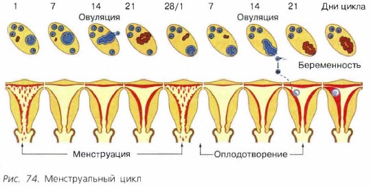 Предшественники яйцеклеток закладываются в организме будущей девочки ещё во время её эмбрионального развития, а их созревание происходит в граафовых пузырьках яичников. Полной зрелости достигают лишь 300—400 яйцеклеток. Период, в течение которого женщина способна к размножению, длится около 30 лет, после чего активность яичников постепенно прекращается. В среднем раз в 28 дней стенка яичника разрывается в том месте, где изнутри к ней прилежит граафов пузырёк, и яйцеклетка выходит в брюшную полость, откуда через бахромчатую воронку попадает в яйцевод (маточную трубу). Этот процесс называется овуляцией. Момент овуляции сопровождается повышением температуры в прямой кишке на 0,5 °с. Обычно овуляция происходит поочерёдно то в левом, то в правом яичнике. В то же время на месте лопнувшего пузырька развивается временная железа внутренней секреции — жёлтое тело, которая вырабатывает гормон прогестерон. Если яйцеклетка будет оплодотворена, то есть наступит беременность, то прогестерон будет обеспечивать протекание беременности. Если же беременность не наступила, то жёлтое тело на 13—14-й день после овуляции прекращает выделение прогестерона и разрушается. В это время разросшаяся под действием прогестерона слизистая оболочка матки отторгается, при этом лопаются довольно крупные кровеносные сосуды, начинается менструация (рис. 74). 77-78