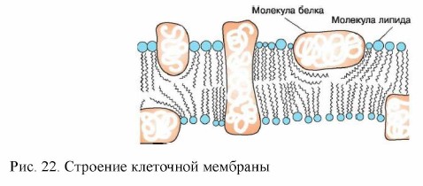 Клетки, несмотря на свои малые размеры, устроены очень сложно. Они содержат структуры для потребления питательных веществ и энергии, выделения ненужных продуктов обмена, размножения. Все эти стороны жизнедеятельности клетки должны быть тесно связаны друг с другом. Исследования, проводившиеся в течение многих десятилетий и не прекращающиеся до сих пор, позволяют нарисовать достаточно полную картину строения клетки. Мы можем связать отдельные функции клетки с множеством различных мельчайших образований, обнаруженных в ней. Внутреннее полужидкое содержимое клетки получило название цитоплазмы. В цитоплазме большинства клеток находится ядро, координирующее жизнедеятельность клетки, и многочисленные органоиды, выполняющие разнообразные функции. Клеточная мембрана отделяет внутреннее содержание клетки от внешней среды. Она защищает цитоплазму и ядро от повреждений, обеспечивает связь клеток между собой, избирательно пропускает внутрь клетки необходимые вещества и выводит из клетки продукты обмена. Строение мембраны у всех клеток одинаково. Её толщина составляет приблизительно 8 нм (1 нм = 10-9 м), и поэтому увидеть мембрану в световой микроскоп невозможно. Данные, полученные при помощи электронного микроскопа, позволили заключить, что основу мембраны составляет двойной слой молекул липидов (рис. 22), в котором расположены многочисленные молекулы белков. Некоторые белки находятся на поверхности липидного слоя, другие пронизывают оба слоя липидов насквозь. Специальные белки образуют тончайшие каналы, по которым внутрь клетки или из неё могут проходить ионы калия, натрия, кальция и некоторые другие ионы, имеющие маленький диаметр. Однако более крупные частицы через мембранные каналы пройти не могут. Молекулы пищевых веществ - белки, углеводы, липиды - попадают в клетку при помощи фагоцитоза или пиноцитоза.