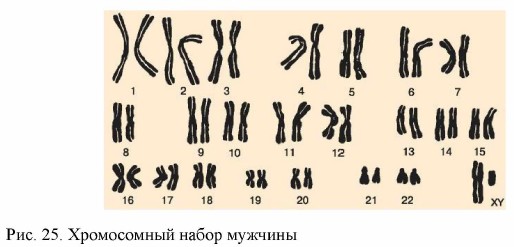 Глава 2. Клеточный уровень § 15. Ядро (окончание)Хромосомный набор клеткиНабор хромосом, содержащийся в клетках того или иного вида организмов, получил название кариотипа. Перед делением клетки хромосомы спирализуются и становятся хорошо различимыми в световой микроскоп. При их рассмотрении становится очевидно, что число хромосом у разных видов живых организмов различное. Если количество хромосом в клетках двух видов животных или растений одинаково, то различными будут размеры и форма (строение) хромосом, т. е. кариотип всегда неповторим. Клетки, составляющие органы и ткани любого многоклеточного организма, получили название соматических. Ядра соматических клеток содержат, как правило, двойной, или диплоидный, набор хромосом, т. е. по две хромосомы каждого вида (рис. 25). Исходно половина хромосом досталась каждой клетке от материнской яйцеклетки и точно такие же хромосомы - от сперматозоида отца. Парные хромосомы (одна - от матери, другая - от отца) получили название гомологичных хромосом. Исключение представляют половые хромосомы: X- доставшаяся от матери и одна из двух - X или Y - доставшаяся от отца. Количество хромосом в ядре клеток какого-либо организма, как ни странно, не определяет уровень его сложности. Так, например, диплоидный набор в клетках аскариды - 2 хромосомы, мушки дрозофилы - 8, зелёной жабы - 26, пресноводной гидры - 32, человека - 46, домашней собаки - 78, речного рака - 118, а миноги - 174. Совершенно очевидно, что жаба устроена ничуть не проще, чем гидра, а человек - не проще, чем собака или минога.
