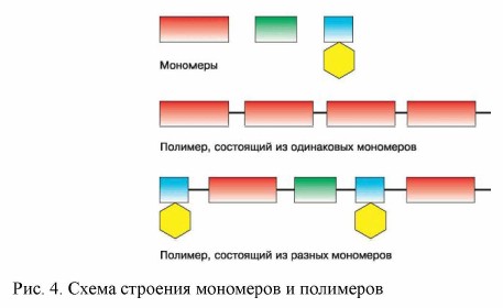 Молекулярный уровень: общая характеристикаЛюбая живая система, как бы сложно она ни была организована, проявляется на уровне функционирования биологических макромолекул. Изучая живые организмы, вы узнали, что они состоят из тех же химических элементов, что и неживые. В настоящее время известно более 100 элементов, большинство из них встречается в живых организмах. К самым распространённым в живой природе элементам следует отнести углерод, кислород, водород и азот. Именно эти элементы образуют молекулы (соединения) так называемых органических веществ. Основой всех органических соединений служит углерод. Он может вступать в связь со многими атомами и их группами, образуя цепочки, различные по химическому составу, строению, длине и форме. Из групп атомов образуются молекулы, а из последних - более сложные молекулы, различающиеся по строению и функциям. Эти органические соединения, входящие в состав клеток живых организмов, получили название биологические полимеры или биополимеры. Полимер (от греч. polys - многочисленный) - цепь, состоящая из многочисленных звеньев - мономеров, каждый из которых устроен относительно просто. Молекула полимера может состоять из многих тысяч соединённых между собой мономеров, которые могут быть одинаковыми или разными (рис. 4).
