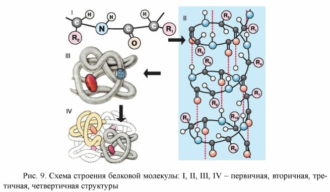 Молекулы белков могут иметь различные пространственные конфигурации - структуры белка, и в их строении различают четыре уровня структурной организации (рис. 9).