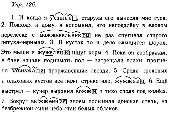 Упр. 127. 1. Но вызывать сейчас огонь артиллери/и было бес/ смысл/енн/о — огонь накрыл бы и наших разведчиков. 2. А Никитич может рас/сужд/а/ть таким манером хоть всю ночь — только развесь уши. 3. Памятник свободе — неволе — стихии — судьбе и конечной победе гения: Пушкину, вое/ ста/вш/ему из цепей. 4. Вот старая сказка, которой быть юн/ой всегда суждено. 5. Явилась юн/ость — праздник мира. 6. Полевая Росси/я! Довольно волочиться сохой по полям! 7. Но и всё же хочу я стальною видеть бедную, нищ/ую Русь/. 8. В городе всё стихло и насторожилось, звучали только шаги матрос/ск/их батальонов, уходивших утром в поле, да тревожные гудки санитарных автомобилей — в порт прибывали из Одесс/ы первые ран/ен/ые. 9. Вспышки бенгальского огня вырывали из мрака масс/ив/н/ые колонн/ ад/ы. Упр. 128. 1. В саду, в горах листвы сверкали белые и небольшие лампочки, — было похоже на иллюминацию. 2. Где брели бойцы понуро, и, скользнув с бревна в ночи, артиллерия тонула, увязали тягачи. 3. Диссонансом больным, невозможным в тишине прозвучали слова. 4. Он ощутил прелести этих садов, где в глубине аллей шумят балтийские волны. 5. От дома, от деревьев, от голубятни и галереи — от всего побежали далеко длинные тени. 6. В гостиной было тихо, так тихо, что явственно слышалось, как стучал по потолку залетевший со двора слепень. 7. Сергей, постояв ещё минуту, медленно направился к груде угля и, аккуратно подстелив полу шинели, сел на большой кусок антрацита. Упр. 129. Кристалл — кристаллический; группа — групповой, программа — программный; параллель — параллельный, шоссе — шоссейный; антенна — антенный; коралл — коралловый; коллектив — коллективный; трасса — трассовый; суффикс — суффиксальный; металл — металлический; прогресс — прогрессивный; масса — массовый; аппарат — аппаратный; колосс — колоссальный; аннексия — аннексированный. Заимствованные слова в процессе словообразования сохраняют своё написание, в том числе двойные согласные, за исключением некоторых слов. Упр. 130. 1. Кричат в кустах коростели (запомнить), и бьют перепела (запомнить), гудит выпь, горят (чередование в корне, безударное положение) первые звёзды, а заря (чередование в корне, безударное положение) ещё долго дотлевает (неизменяющаяся приставка до-; провер. слово тлеть) над далями и туманами. 2. «О, концерт (о — запомнить; е после ц — в соответствии с произношением) большой (в окончании после шипящего под ударением) будет», — обронил (обронит) кто-то из мужиков (после шипящего). 3. О любимые сердцем (сердечко; в окончании после ц под ударением) обманы. 4. Воздушный лайнер (запомнить) гудел реактивными (запомнить) двигателями на высоте девяти (девятка) тысяч (запомнить) метров, и здесь, в солнечном арктическом холоде, за толстыми стёклами иллюминаторов (заимствованное слово), сияли глыбами, проплывали (неизменяемая приставка про-; ы в корне — в соответствии с произношением) по горизонту (запомнить) ослепительно (ослепнуть) сахарные айсберги (запомнить). 5. В кармане галифе (запомнить) Сергей нащупал крошки (крошить) махорки (запомнить) и, осторожно стряхнув (стряхивать) его содержимое (держит; и после шипящего) в руку, завернул (завертится) толстую неуклюжую цигарку (в корне слова). 6. И вот, неожиданно для всех, я выдержал (держит) блистательно (чередование в корне; после корня есть суффикс -а-) экзамен (запомнить). 7. Бедные поэты (запомнить) — в зар