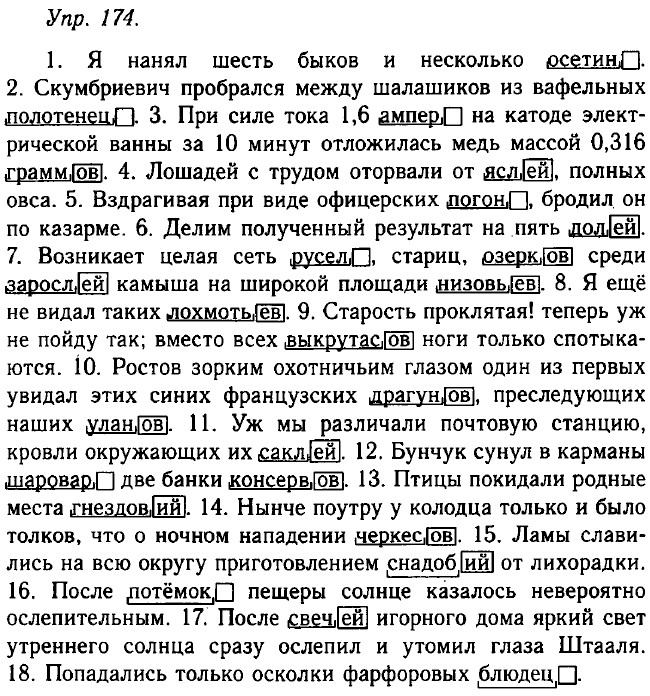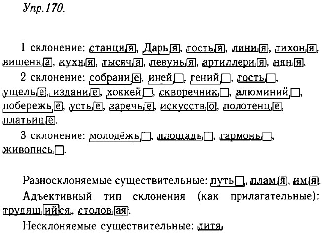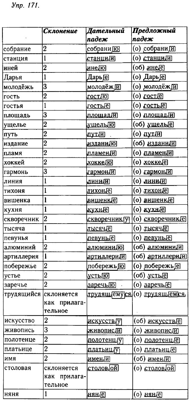 Упр. 172. Мария — о Марии (1 скл., сущ. с основой на -и, пр. п.), периферия — на периферии (1 скл., сущ. с основой на -и, пр. п.), Забайкалье — о Забайкалье (2 скл., сущ. ср. р. на -ье, пр. п.), София — о Софии (1 скл., сущ. с основой на /i>-и, пр. п.), лезвие — о лезвии (2 скл., сущ. с основой на -и, пр. п.), планетарий — в планетарии (2 скл., сущ. с основой на -и, пр. п.), Заполярье — в Заполярье (2 скл., сущ. ср. р. на -ье, пр. п.), Наталия — о Наталии (1 скл., сущ. с основой на -и, пр. п.), варенье — в варенье (2 скл., сущ. ср. р. на -ье, пр. п.), варение — о варении (2 скл., сущ. с основой на -и, пр. п.), гений — о гении (2 скл., сущ. с основой на -и, пр. п.), экскурсия — на экскурсии (1 скл., сущ. с основой на -и, пр. п.). Упр. 173. 1. Хотелось ей жить и любить горячо. Но вынесла все истязания. Погибла, врагу не сказав ничего, свершив этот подвиг молчания. 2. К Анисье дети побежали, у ней ключи взять от сеней. 3. Эти зори без затменья, этот вздох ночной селенья, эта ночь без сна. 4. Месяц поздних поцелуев, поздних роз и молний поздних! Ливней звёздных — август! 5. Ни в лодке, ни в телеге нельзя попасть сюда. Стоит на гиблом снеге глубокая вода. 6. Я теперь не сумею припомнить, какое дело иль какой каприз судьбы забросил меня на целую зиму в этот маленький северный русский городишко, о котором учебники географии говорят коротко, не приводя о нём никаких сведений. 7. В знойном воздухе повисла угнетающая тоска, когда народ густой толпой окружил Степана и Марью.