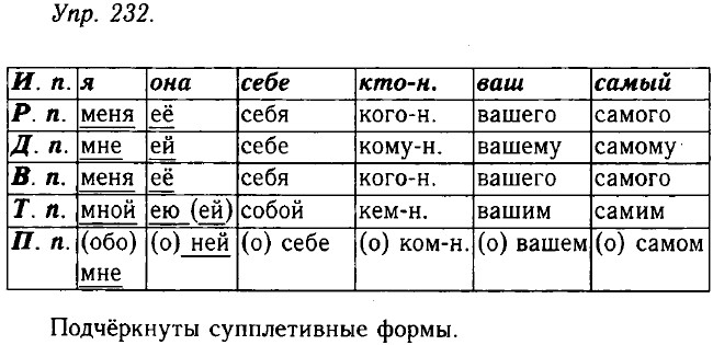 Упр. 234. 1. А в страны грёз твоих мосты, надеюсь, сам достроишь ты. 2. У крыльца толпились... неуклюжие гайдуки, навьюченные шубами и муфтами их господ. 3. Пробираясь берегом к своей хате, я невольно всматривался в ту сторону, где накануне слепой дожидался ночного пловца. 4. Хочешь видеть жребий твой в зеркале, Светлана? Ты спросись с своей душой! 5. Там стадо моего отца пасла я с детских лет. 6. И мы вспоминаем нашу молодость. 7. Не уезжай, лезгинец молодой; зачем спешить на родину твою? 8. Тебе, Казбек, о страж Востока, принёс я, странник, свой поклон. 9. Что это вы везёте в вашей лодке? 10. Безродного пригрел и ввёл в своё семейство. 11. Не встретишь завтра поцелуя несчастной матери твоей. Упр. 235. Определительные местоимения каждый, любой, всякий — синонимы, различаются оттенками значений, употребляются в соответствии с требованиями контекста. Чаще всего они легко могут заменить друг друга, но есть случаи, когда взаимозамена невозможна. Например, в предложении: 8. Открой мне всю правду, не бойся меня: в награду любого возьмёшь ты коня.
