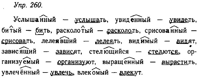 Упр. 261. Строить — строящий, строимый; слышать — слышащий, слышимый; начинать — начинающий, начинаемый; вешать — вешающий; читать — читающий, читаемый; писать — пишущий; бродить — бродящий; любить — любящий, любимый; стелить — стелющий, стелимый; бороться — борющийся, боримый; клясться — клянущийся; вопить — вопящий, вопимый; обещать — обещающий, обещаемый; кушать — кушающий, кушаемый. Победить, завоевать, рассказать — переходные глаголы совершенного вида, не образуют действительные и страдательные причастия настоящего времени. Упр. 262. Ненавидеть — ненавидевший; выстроить — выстроивший, выстроенный; прочитать — прочитавший, прочитанный, вырастить — вырастивший, выращенный; обидеть — обидевший, обиженный; привести — приведший, приведённый; нести — несший; принести — принесший, принесённый; прекратить — прекративший, прекращённый; объявить — объявивший, объявленный; бросить — бросивший, брошенный; бриться — брившийся; возить — возивший; возиться — возившийся; страдать — страдавший; начать — начавший, начатый; обвесить — обвесивший, обвешенный; обвешать — обвешавший, обвешанный; поклясться — поклявшийся. Страдательные причастия прошедшего времени нельзя образовать от переходных глаголов несовершенного вида и от непереходных глаголов совершенного и несовершенного вида. Упр. 263. 1. И взор блуждает по брегам,