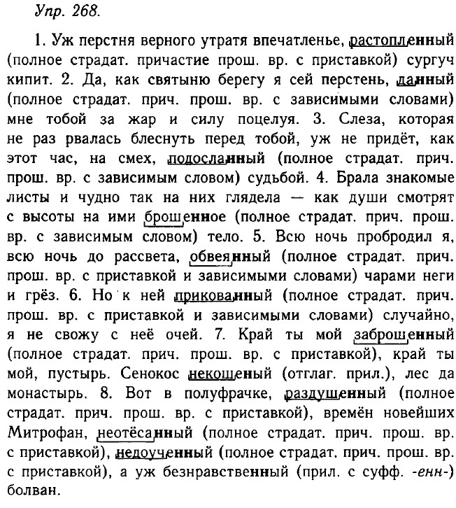 Самостоятельные части речи Правописание суффиксов причастий. Н и НН в причастиях и отглагольных прилагательныхУпр. 264. Выделенные слова в каждом первом словосочетании являются именами прилагательными, во втором — причастиями. Упр. 265. 1. Сдержанное приветствие. В сборник вошли избранные произведения русских классиков. Признанный учёный. Обиженный вид. Доверенное лицо (< доверить). Умеренный аппетит. Истощённая почва. Возвышенный стиль. 2. Варёное яйцо, вяленая рыба, званый обед, глаженый костюм, мочёные яблоки, кипячёная вода, студёная вода, клееный конверт, езженая дорога, плавленый сыр, слоёный пирог. До самого горизонта простирался кошеный луг, пахнущий сеном и зноем. Печёный хлеб с парным молоком бабушка подавала на завтрак. Внук заглядывал деду в глаза и терпеливо ждал ответа на свой мудрёный вопрос. Упр. 266. Взволнованный учитель — взволнован (кр. прич.) известием, ученики взволнованны (кр. прил.); иллюстрированный журнал — иллюстрирован (кр. прич.) фотографиями, сказки иллюстрированны (кр. прил.); квалифицированный работник — квалифицированы комиссией (кр. прич.), работники квалифицированны (кр. прил.); образованный человек — город образован (кр. прич.), девушка образованна (кр. прил.), экзальтированный юноша — экзальтирован (кр. прич.) прочитанным, дети экзальтированны (кр. прил.); цивилизованный мир — цивилизован (кр. прич.) колонизаторами, порядки цивилизованны (кр. прил.), очарованный зритель — очарован (кр. прич.) зрелищем, берёза очарованна (кр. прил.); импровизированный концерт — импровизирована (кр. прич.) целиком, танцы импровизированны (кр. прил.); монополизированный рынок — монополизирован (кр. прич.) крупным предприятием, торговля монополизированна (кр. прил.). Упр. 267. Варёный (отглаг. прил.) картофель — варенный (причастие) на костре картофель; мощёные (отглаг. прил.) улицы — мощённые (прич.) булыжником улицы; поношенное (прич.) платье — ношенное (прич.) сестрой платье; печёный (отглаг. прил.) картофель — печённый (прич.) в золе картофель; крашеные (отглаг. прил.) полы — выкрашенные (прич.) полы; мороженое (отглаг. прил.) мясо — замороженное (прич.) мясо; вяленая (отглаг. прил.) рыба — провяленная рыба (прич.); глаженое (отглаг. прил.) бельё — выглаженное (прич.) бельё.
