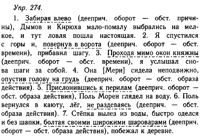 Самостоятельные части речи Деепричастие как глагольная формаУпр. 272. Заметить — заметя, заметив, заметивши. Написать — написав, написавши. Привести — приведя, приведши. Ступать — ступая, ступавши. Писать — писав, писавши. Надеть — надев, надевши. Глядеть — глядя, глядев, глядевши. Закрыть — закрыв, закрывши. Свалиться — свалясь, свалившись. Встретить — встретя, встретив, встретивши. Выйти — выйдя. Возвратиться — возвратясь, возвратившись. Строить — строя, строив, строивши. Быть — будучи, бывш. Взбежать — взбежав, взбежавши. Обезуметь — обезумя, обезумев, обезумевши. Услышать — услыша, услышав, услышавши. Упр. 273. 1. И сразу с мест, взяв (сов. в., одноврем. действие) ружьё наперевес, поблескивая (несов. в., одноврем. действие) лакировкой своих металлических киверов, первые батальоны владимирцев двинулись вперёд. 2. Попав (сов. в., предшеств. действие) из потёмок в световой круг, он остановился как вкопанный. 3. Он вынырнул и, фыркая (несов. в., одноврем. действие), пуская (несов. в., одноврем. действие) пузыри, открыл глаза. 4. Княгиня внутренне радовалась, глядя (несов. в., одноврем. действие) на дочку. 5. Мери сидела на своей постели, скрестив (сов. в., послед, действие) на коленях руки. 6. Вытащив (сов. в., предшеств. действие) из- за голенища сигнальные флажки, он коротко взмахнул ими, подавая (несов. в., одноврем. действие) сигнал. 7. Что-то насвистывая (несов. в., одноврем. действие), он медленно, своей обычной солдатской походкой, вышел из кабинета.