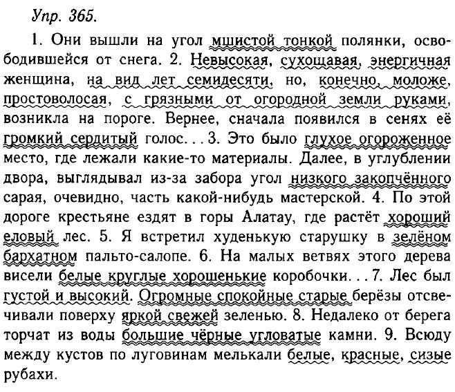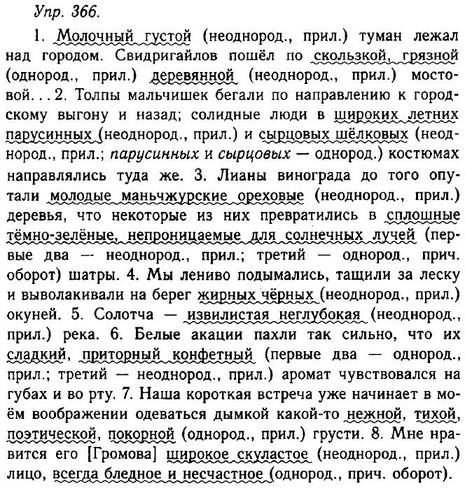 Упр. 369. В первом словосочетании — неоднородные определения, во втором — однородные, имеющие значение уточнения. 1. Высокая стройная женщина стояла у окна и смотрела в сад. — Забыть её невозможно: высокая, стройная женщина, с горделивой осанкой, строгим выражением лица. 2. Спелые сочные фрукты украшали праздничный стол. — Она придирчиво отбирала только спелые, сочные фрукты и красиво укладывала их на блюде. 3. Красивый бодрый юноша, недавно появившийся на факультете, поразил Наташу неожиданно тонкими замечаниями. — Новый член команды оказался красивым, бодрым юношей с необыкновенно быстрой реакцией. 4. Были и другие заманчивые предложения, поступившие на кафедру ядерной физики. — Другие, заманчивые предложения он даже не рассматривал — так увлёкся своей идеей, воплотить которую надеялся в таёжной глуши.