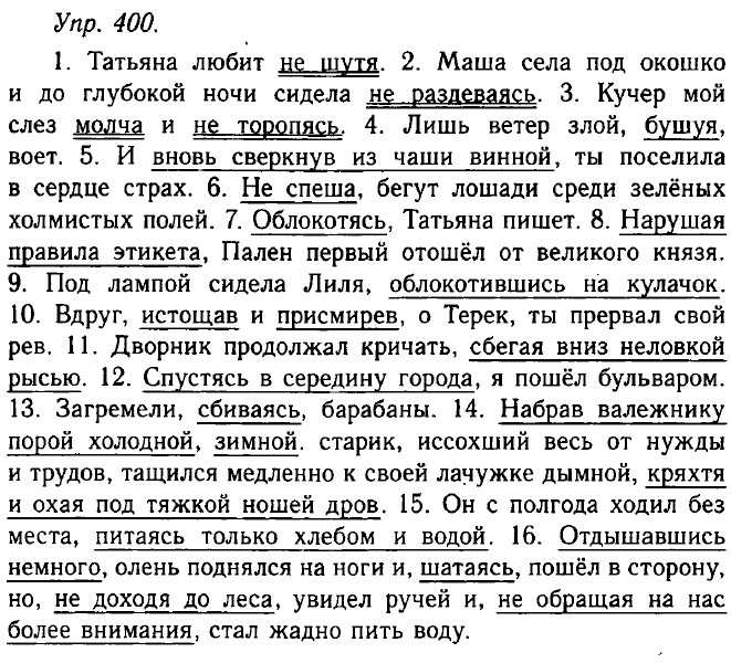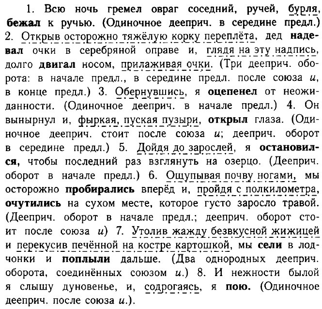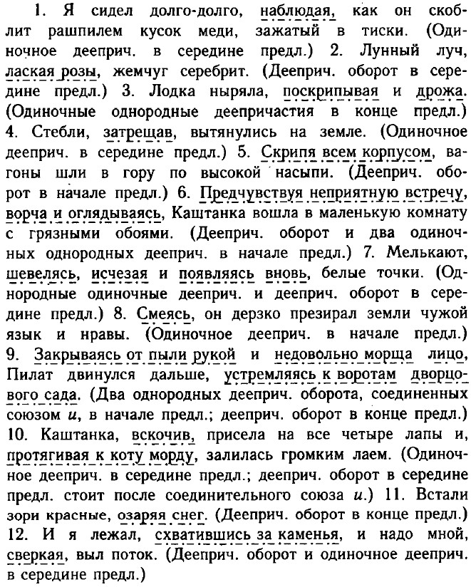 Упр. 399. 1. Вокруг нашего дома стояли, задумавшись, огромные каштаны. 2. Я ваш покой смутить моим признаньем, благоговея, никогда не смел. 3. Пастух шёл, напевая, за стадом жадных и пугливых овец. 4. Улыбкой ясною природа сквозь сон встречает утро года; синея, блещут небеса. 5. И струны ластились к нему звеня, но, ластясь, трепетали. 6. И прядь волос так близко от меня, так близко от меня, развившись, трепетала. 7. Отдыхая, я долго лежал на кургане. 8. Благоухая, сохли травы, дымясь, курились облака. 9. Проплывают льдины звеня. 10. Самовар уже стоял на столе, шипя и курлыкая. В предложениях 5 и 9 слово звеня является наречием образа действия (способ образования неморфологический — переход из одной части речи в другую — из деепричастия в наречие), примыкает к глаголу-сказуемому, запятыми не выделяется.