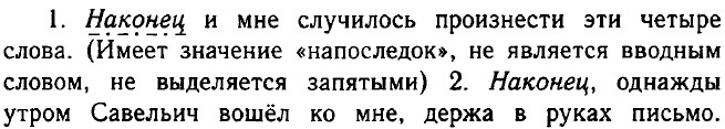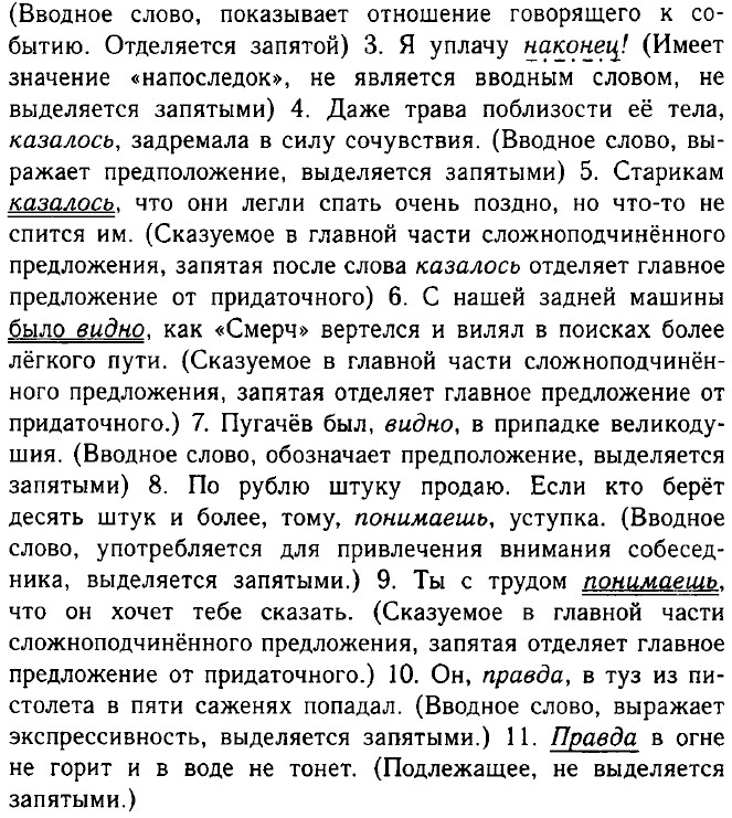 Знаки препинания при словах и конструкциях, грамматически не связанных с предложением Вводные слова и вставные конструкцииУпр. 419. Слова, выражающие чувства говорящего и его отношение к высказываемому: к прискорбию. Слова, выражающие оценку реальности сообщаемого: возможно, может быть, должно быть, по всей вероятности, видимо, видно, знать. Слова, указывающие на источник высказываемого: говорят. Слова, указывающие на последовательность высказывания, на связь мыслей: между прочим, в-третьих, наконец, итак, впрочем, кстати. Слова, употребляемые с целью привлечения внимания собеседника: извините. Слова, указывающие на приёмы и способы оформления мыслей: вообще-то говоря, в общем, собственно говоря, словом. Слова, выражающие экспрессивность: смею сказать. Возможно, мне никогда не удастся его понять, но любить его я не перестану. Мы, между прочим, старые приятели, и я имею право помочь тебе и вытащить тебя из беды. Больно горячий парень, отчаянный, знать, не сносить ему головы. Кстати, как поживает ваша матушка? Должно быть, он всё это время поджидал нас у калитки. Упр. 420. 1. Я, признаюсь, тут ничего не понимаю. 2. К счастью, перед самой смертью Жеребцов, будучи уже в отставке, познакомился с писателем Евсеенко. 3. Вам, наверно, не раз приходилось видеть иллюстрации разных художников к сказке о царе Салтане. 4. Вы, конечно, любовались Московским Кремлём из-за Москвы-реки. Говорят, вся Москва была по главному, архитектурному звучанию, как этот уцелевший пока Московский Кремль. 5. Может быть, вы знаете, что многие уничтоженные памятники были незадолго перед этим отреставрированы? 6. Улица эта называется улицей Бродского. Ну так, наверно, он жил на этой улице. Во-первых, мало ли кто где живёт. Во-вторых, он на этой улице не жил. В-третьих, на Площади искусств есть квартира-музей художника Бродского (казалось бы, довольно). В-четвёртых, это действительно тот самый... 7. Познакомился я раз с Полутыкиным, страстным охотником и, следовательно, отличным человеком. 8. По свидетельству всех исторических записок, ничто не могло сравниться с вольным легкомыслием, безумством и роскошью французов того времени. 9. Говорят, грузовик попал на полынью. 10. Видимо, не так сильно зацепила меня эта зимняя рыбалка. Упр. 421. 1. Действительно (утверждение), мы не дорожим воздухом и не думаем о нём. 2. «Впрочем (связь мыслей), что до меня, — сказал он, — мне, признаюсь (доверительность), более всех нравится полицмейстер». 3. Без сомнения (уверенность), именно поэтому с такой отчётливостью запомнились мне первые годы. 4. Должно быть (предположение), у меня был жар, потому что я нёс какую-то бессвязную чепуху. 5. Это был, по его словам (ссылка на источник высказывания), город, в котором груши, яблоки, апельсины росли прямо на улицах. 6. Распахнёшь, бывало (показывает степень обычности того, о чём говорится), окно в прохладный сад, наполненный лиловатым туманом, сквозь который блестит кое-где утреннее солнце, и не утерпишь — велишь поскорее засёдлывать лошадь. 7. По-видимому (предположение), никто из домашних ничего не подозревал, и жизнь текла по-обычному. 8. Вечером, по обыкновению (показывает степень обычности того, о чём говорится), я занимался в своей комнате, писал дневник и письма. 9. Служил, знаешь (привлекает внимание собеседника к предмету разговора), в департаменте, а теперь сюда переведён столоначальн