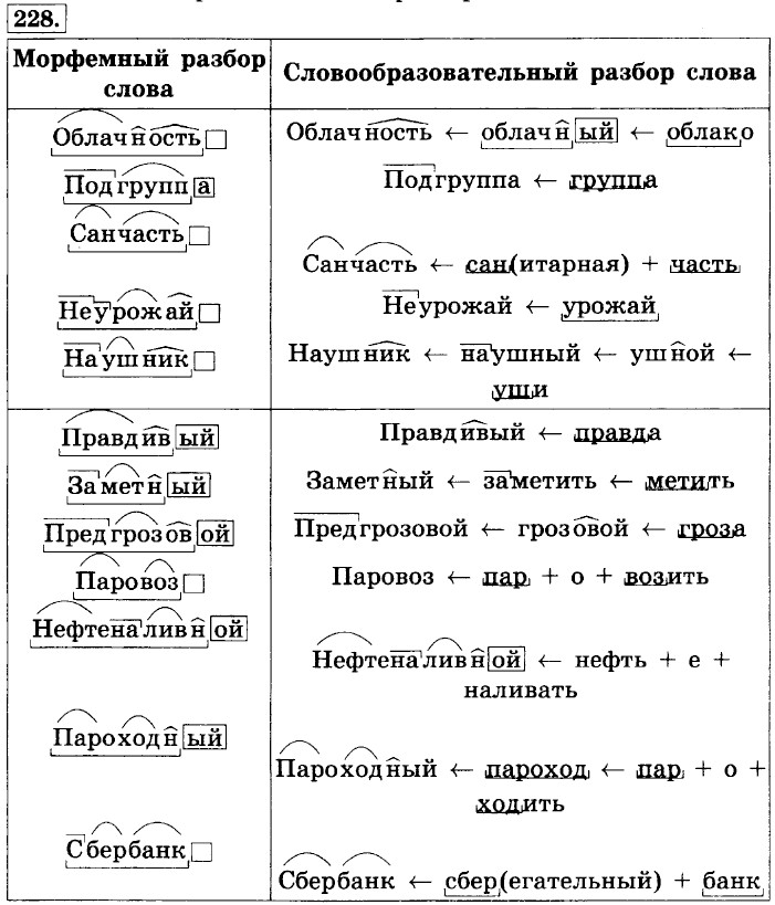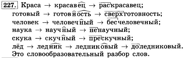 Упр. 229 Приятный — неприятный — пренеприятный; разговор — разговорчивый — разговорчивость; красить — украсить — приукрасить; боль — болезнь — болезненный — болезненность. Упр. 230 Набирать скорость (вин. п.), разгорается на востоке (предл. п.), приземляется с парашютом (твор. п.), растёт с приближением (твор. п.) к Земле (дат. п.), коснуться Земли (род. п.), преодолеть большое расстояние (вин. п.), температура за бортом (твор. п.) самолёта (род. п.), приободрить товарища (вин. п.), произвести великолепную посадку, превзойти мировой рекорд (вин. п.), приветствовать экипаж (вин. п.), рассказ лётчика-испытателя (род. п.).