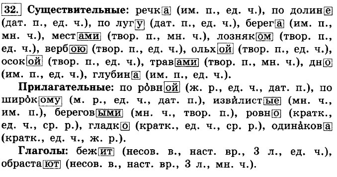 Повторение изученного в 5 классе Части речиУпр. 31 На закате дняЗакат тяжело пылает на кронах деревьев, золотит их старинной позолотой. Внизу, у подножия сосен, уже темно и глухо. Бесшумно летают, как будто заглядывают в лицо, летучие мыши. Какой-то непонятный звон слышен в лесах — звучание вечера, догоревшего дня. А вечером блеснёт, наконец, озеро, как чёрное, косо поставленное зеркало. Ночь уже стоит над ним и смотрит в его тёмную воду, — ночь, полная звёзд. На западе ещё тлеет заря, в зарослях волчьих ягод кричит выпь, и на мшарах бормочут и возятся журавли, обеспокоенные дымом костра. Всю ночь огонь костра то разгорается, то гаснет. (К. Паустовский) Тип речи — повествование, стиль речи — художественный. Пылает (несов. в., I спр.). Старинной (ж. р., твор. п.). У подножия (ср. р., на -ие, род. п.). Непонятный (м. р., им. п.). Чёрное (ср. р., им. п.). Смотрит (несов. в., II спр., иск л.). Ночь (ж. р., 3-е скл., вин. п.). Разгорается (несов. в., I спр.) В лесах — сущ. I. (Где?) в лесах.