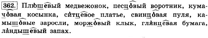 Упр. 363 а) Ежо́вый, кулачо́к, пунцо́вый, каблучо́к, под плащо́м, чужо́й, со свечо́й, борцо́в, за врачо́м, с мячо́м, над крыльцо́м, большо́й, образцо́вый, медвежо́нок, ручо́нка. б) Лицевой, пищевой, свежего, ключевой, перед товарищем, хорошего, пальцев, под крышей, дрожжевой, кольцевой, биржевой, дешёвый.