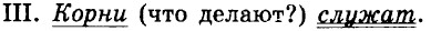 I. (Что делают?) служат. Н. ф.— служить. II. Пост. — несов. вид, неперех., II спр.; непост. — изъявит, накл., 3-е л., наст, вр., ед. ч.