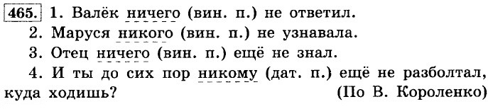 Упр. 467 Не́ с кем, ни во что́, не́ у кого, ни для чего́, ни от кого́, ни перед че́м. Не́ с кем словом перемолвиться, ни во что́ не ставил, ни для чего́ не сгодился, ни от кого́ не прятался, ни перед че́м не остановится.