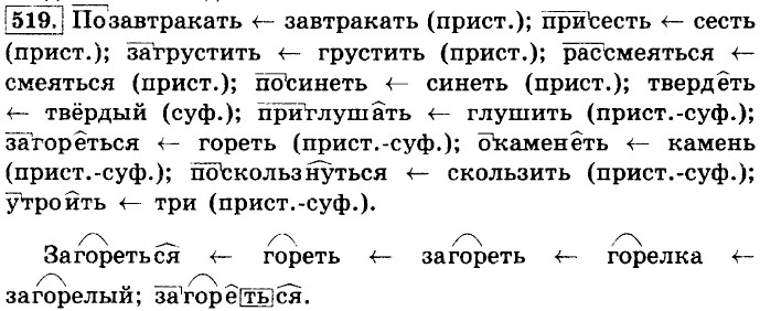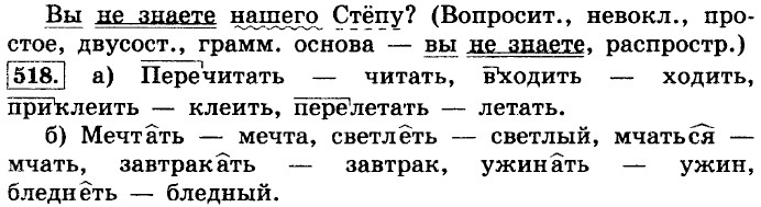 Повторение изученного в 5 классе Глагол (окончание)Упр. 515 1. Исколесить (прист.), краснеть (суф.), застопорить (прист.), секретничать (суф.), подытожить (прист.-суф.), запомниться (суф.). 2. Разбежаться (прист.-суф.), отталкиваться (прист.- суф.), перепрыгивать (прист.-суф.), соскакивать (прист.- суф.). Упр. 516 Заголовок — Хозяйственный парень. Совершенный вид: открыл, не упал, увидел, посмотрел, был, рассказать, спросил, узнаешь, сказал, пошёл, воскликнул, пригорит. Несовершенный вид: приходил, был, горел, есть хочешь. Элементы разговорного стиля: не упал в обморок, горел нетерпением, у меня пригорит. Мамину — прил. I. (Какую?) мамину.