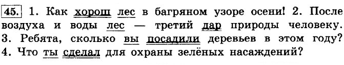 1. В школьном саду учащиеся обреза́ли сухие сучья на фруктовых деревьях: яблонях, грушах, вишнях, сливах. 2. Девочки составляли коллекции жёлтых, багряных и красно-бурых осенних листьев для украшения класса. 3. После дружной работы ребята разговаривали и веселились. 4. Ребята взяли сумки, портфели, пакеты с обувью и пошли домой. Упр. 47 Золотая осеньПо опушкам лесов ещё растут грибы: красноголовые подосиновики, зеленоватые и розовые сыроежки, скользкие грузди и душистые рыжики.