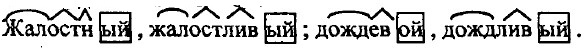 Имя прилагательное § 21. Словообразование имён прилагательныхУпр. 212 (149). Жалостная песня, жалостный взгляд, жалостный стон, жалостный голос; жалостливый человек, жалостливый взгляд. Дождевая вода, дождевые потоки, дождливый год, дождливый сезон, дождливая погода.