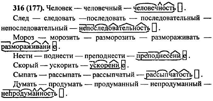 Упр. 317 (178). Суффикс И показывает, что действие совершается над неким объектом: белить (Мастер белит стены). Е указывает на то, что сам предмет производит действие (Лес белеет под снежным покровом.) Упр. 318 (179). Скрестить, скупить, слезать, слизать, смешать, совладелец, справа, сверять, свершить. Скрестить — сложить крестом, слизистый — покрытый слизью, совладелец — совместно владеющий, советовать—давать советы.