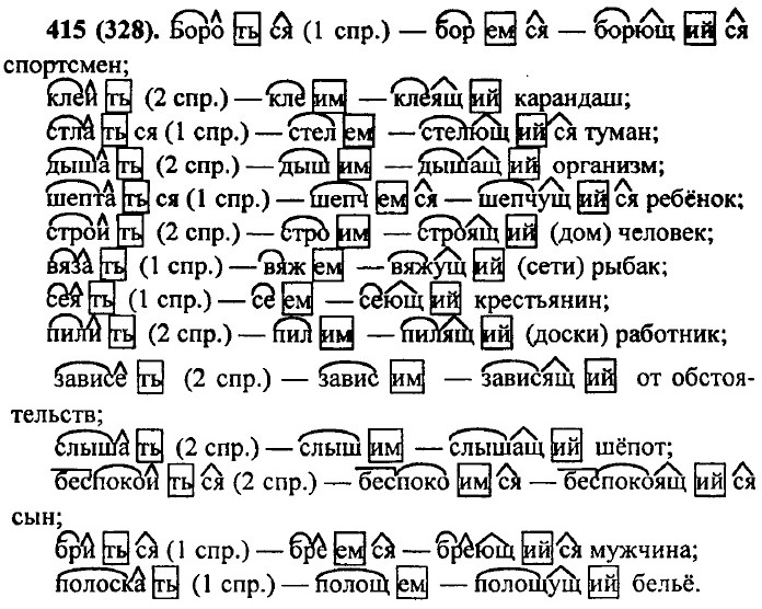 Причастие Образование причастий. Действительные и страдательные причастияУпр. 411 (324). Действительные причастия: ученик, выполняющий упражнение; ветер, колеблющий ветви деревьев; агроном, исследующий почву; ученики, любящие учителя. Страдательные причастия: упражнения, выполняемые учеником; ветви деревьев, колеблемые ветром; почва, исследуемая агрономом; учитель, любимый учениками. Упр. 412 (325) — устно. Упр. 413 (326) — устно.
