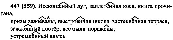 Упр. 444 (356). Получить — полученное — получено; заметить — замеченное — замечено; развинтить — развинченное — развинчено; прочувствовать — прочувствованное — прочувствовано; поразить — поражённое — поражено; застроить — застроенное — застроено; рассказать — рассказанное — рассказано; восстановить — восстановленное — восстановлено; взволновать — взволнованное — взволновано; разбудить — разбуженное — разбужено.