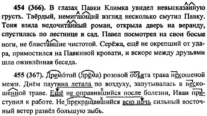 Книга не прочитана, ёлка не украшена, задание не выполнено, ошибка не замечена, письмо не сожжено, посылка не получена, работа не закончена, стройка не завершена. Упр. 453 (365). Мы давно не были в своём деревенском доме. Во- первых, неотремонтированный дом потерял свой нарядный вид; стёкла потускнели, невыкрашенные стены выглядели уныло, печь осталась невыбеленной и не радовала глаз. Мы дружно взялись за работу и через неделю вернули жилью его прежний праздничный облик. Всё, что было не выкрашено, не вымыто, не прибрано, засверкало чистотой. Отдых начался!