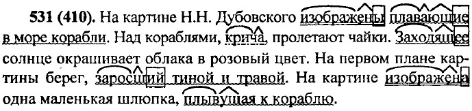 Упр. 529 (408). Закрыв книгу, мы надолго запомним её героев. Получив письмо из деревни, я сильно обеспокоился. Когда мы возвращались домой, пошёл дождь. Когда я пришёл в магазин, он оказался закрыт. Подплывая к берегу, я уронил в воду зонт. Упр. 530 (409) Лазурь небесная смеётся, ночной омытая грозой. Наклонившись над полыньёй, Анна Васильевна разглядела тянущуюся со дна тоненькую нитку. Не достигая поверхности воды, она лопалась мелкими пузырьками. Этот тонюсенький стебелёк с пузырьками был похож на ландыш. Надвигались зимние сумерки... всё было серо, тихо в деревушке, приютившейся около лощинки, среди снежных полей, слившихся с тёмным небом... слышались голоса баб, скликавших выпущенных овец. Привыкнув к ухаживавшим за ними людям, бобры не страшились выходить днём из построенных для них деревянных хаток. Речка девочкой невзрачной
