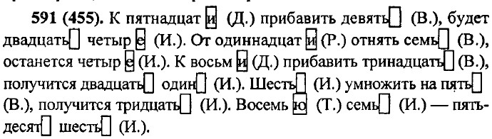 Упр. 589 (453). Числительные один и два изменяются по падежам и по родам. Числительные три и четыре имеют разные формы в винительном падеже, в зависимости от того, к одушевленному или неодушевленному сущ. они относятся. Упр. 590 (454). Р. п. восьми апельсинов, одиннадцати дней, двенадцати месяцев, девятнадцати колец, двадцати брошюр, двадцати трёх страниц. Т. п. восемью (восьмью) апельсинами, одиннадцатью днями, двенадцатью месяцами, девятнадцатью кольцами, двадцатью брошюрами, двадцатью тремя страницами.