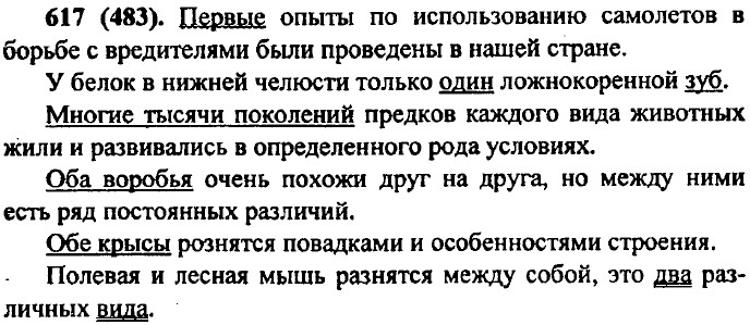 Упр. 618 (484). Стричь под одну гребёнку — уравнивать кого-либо с кем-либо; остаться в одной рубашке — в крайней нужде оказаться; звезда первой величины — известный, прославившийся в какой- либо области; играть первую скрипку — быть главным в каком- либо деле; всыпать по первое число — наказать по всей строгости; из третьих рук — узнать, получить что-либо через посредников; гнать в три шеи — выгонять грубо, с бранью и побоями; пятое колесо в телеге — лишний, ненужный в каком-либо деле человек; семи пядей во лбу — очень мудрый, умный, выдающийся; за семь вёрст киселя хлебать — далеко и попусту идти, ехать; быть на седьмом небе — испытать чувство восторга; работать до седьмого пота—до крайнего утомления, до изнеможения. Упр. 619 (485). На один зуб — очень мало; одна нога здесь, другая там — очень быстро, молниеносно; одного поля ягода — один другого стоит, один другого не лучше; семь пятниц на неделе — о том, кто часто меняет свои решения; семь потов сошло — очень усердно работал; наговорить с три короба — очень, чрезвычайно много; из первых рук — непосредственно от кого-либо, опять двадцать пять — выражение недовольства по поводу чего-нибудь повторяющегося и надоевшего; на своих двоих — пешком; как свои пять пальцев — знать очень хорошо; как две капли воды — совершенно, очень сильно похожи. Упр. 620 (н). — устно.