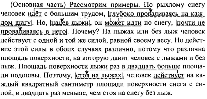 Значит, от того, какая сила действует на каждую единицу площади поверхности, зависит результат действия этой силы. Величина, равная отношению силы, действующей перпендикулярно поверхности, к площади этой поверхности, называется давлением. (Заключение) Следовательно, чтобы определить давление, надо силу, действующую перпендикулярно поверхности, разделить на площадь поверхности. Тип — рассуждение, стиль — научный. План. 1. От чего зависит результат действия силы? 2. Как чувствует себя человек на снегу на лыжах и без лыж? 3. Что такое давление? 4. Что надо сделать, чтобы определить давление.