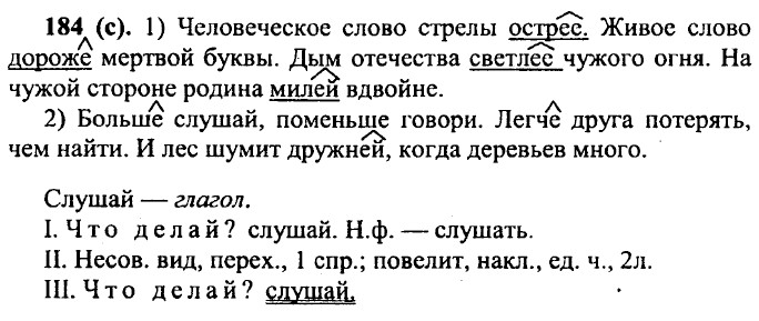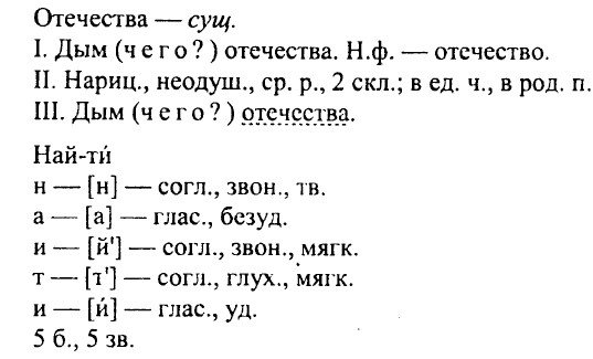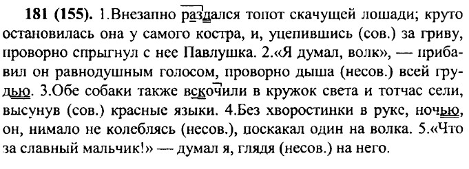 181(c). На лыжах Воскресный зимний день. Сегодня не надо идти в школу, и можно поспать подольше. Но солнце светит ярко, и я решаю погулять в парке. Я беру с собой лыжи и направляюсь туда. В парке свежо и морозно, ярко блестит еще не тронутый снег. Я надеваю лыжи и скольжу легко и свободно в глубину парка. Там свежий воздух, дышится легко. Отсюда не хочется уходить. Но уже пора домой — на выходной у меня еще много планов. 182 (156). 1. От реки шел туман, окутывая прибрежные кусты. 2. Турист быстро шагал по тропинке, весело посвистывая. 3. Тропинка, извиваясь змейкой, вела к камышовым зарослям. 4. Собака бежала впереди охотника, постоянно оглядываясь. 5. Тетерев, тяжело взмахнув крыльями, поднялся и полетел. 6. (Стадо уток) Утки, покружившись над городом, сели (село) на воду около тростника. 183 (157). 1. Семиклассники, посетив Третьяковскую галерею, задали много вопросов экскурсоводу. 2. Рыболовы, надеясь на хорошую погоду, с раннего утра засели на берегу пруда с удочками. 3. По морю идет теплоход, держа курс на восток. 4. Самолет, поднявшись в воздух в семь часов, взял курс на юг. Сложные слова: экскурсовод, рыболовы, теплоход, самолет. Эти слова образованы путем сложения основ с помощью соединительной гласной. 184 (158). Идя за бригадиром, Женька старался принять независимый вид. Ему поручили рычагом-крючком двигать заготовку по наковальне. Нехитрое дело для кузнеца шестого разряда, умеющего «чувствовать металл». Новым было только то, что огромный молот действовал непрерывно, как сердце, ни на мгновение не теряя ритма, не замедляя хода. Под его ударами четырехугольный стальной брус заготовки округлялся, выпрямлялся, выравнивался, принимая постепенно форму вагонной оси. Не отрывая глаз от багровеющего металла, бригадир кивал головой то медленно и плавно, то резко и отрывисто. Нехитрый — несложный, легкий, простой, доступный.
