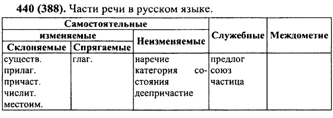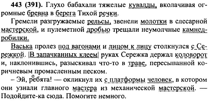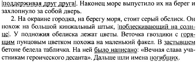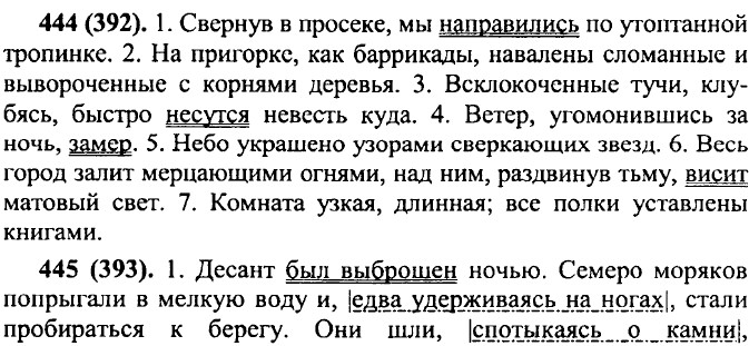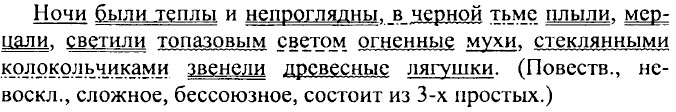 441 (389). Это мой (притяж. мест.) портфель, мой (гл. не- сов.вид, перех., 1 спр.) руки. Простой (качеств, прил.) план, простой (нариц. сущ., неодуш., м.р., 2 скл.) вагонов на станции. Бег (нариц. сущ., неодуш., м.р., 2 скл.) на месте, бегать (гл. несов.вид, неперех., разноспряг.) по площадке. Зеленые (качеств, прил.) листья березы, зеленеющие (действ, прич., наст.вр., несов. вид) листья березы. Белизна (нариц. сущ., неодуш., ж.р., 1 скл.) облаков, белеющие (действ, прич., наст.вр., несов. вид) облака, белые (качеств, прил.) облака, белеть (гл. несов. вид, неперех., 1 спр.) на фоне неба. Тройка (нариц. сущ., неодуш., ж.р., 1 скл.) за ответ, три (числит., прост., колич., целое) товарища, тройной (относит, прил.) прыжок, утраивать (гл. несов. вид, перех., 1 спр.) силы. Положить выше (нар. ср. ст., неизм.), этот дом выше (качеств, прил.). Решение неверно (качеств, прил.), отвечал неверно (нареч. призн. действ., неизм.). 442 (390). 1. Ночи были теплы и непроглядны, в черной тьме плыли, мерцали, светили топазовым светом огненные мухи, стеклянными колокольчиками звенели древесные лягушки. 2. В прибрежном овраге, спускавшемся из лесу к морю, быстро прыгала но каменистому ложу мелкая, прозрачная речка. 3. Как чудесно дробился, кипел ее блеск в тот таинственный час, когда из- за гор и лесов, точно какое-то дивное существо, пристально смотрела поздняя луна! 4. Горячее солнце было уже сильно, чисто и радостно. 5. В лесах лазурно светился, расходился и таял душистый туман, за дальними лесистыми вершинами сияла предвечерняя белизна снежных гор.