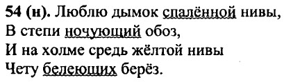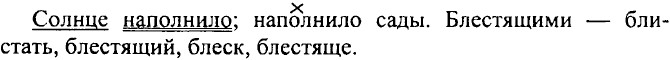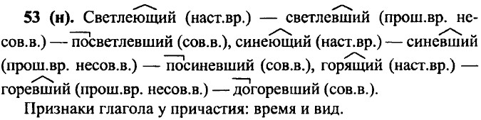 55 (н). Я считаю, что причастие — это самостоятельная часть речи, потому что у него есть своё общее значение — проявляющийся во времени признак предмета по действию. Также у причастий есть свой особый набор морфологических признаков (вид, время, число, падеж и род) и в предложении они могут выступать в роли определений или сказуемых. 56 (46). Стиль текста — художественный. 1) Расстилавшейся (тв. п., ед. ч., ж. р.) картиной; залитой (род. п., ед. ч., ж. р.) пристани, собравшегося (род. п, ед. ч., м. р.) народа; покрытый (вин. п., ед. ч., м.р.) лед, загораживавшие (вин. п., мн. ч.) горы; изъеденный (им. п., ед. ч., м. р.) снег; припухшие (вин. п., мн. ч.) ветви. 2) Бойкой (род. п., ед. ч., ж. р.) пристани; тысячеголосой (тв. п., ед. ч., ж. р.) волной; синевато-грязный, рыхлый (вин. п., ед. ч., м. р.) лед; желтыми (тв. п., мн. ч.) наледями; черными (тв. п., мн. ч.) полыньями; густым (тв. п., ед. ч., м. р.) ельником; могучей зеленой (тв. п., ед. ч., ж. р.) щеткой; весенняя (им. п., ед. ч., ж. р.) травка; березы голы (мн. ч.); красноватые (вин. п., мн. ч.) ветви. Распахнув, подняла. 57 (47). 1. На всем протяжении реки только в одном месте к ней подходит неведомо куда ведущая (несов. в., наст, вр.) дорога. 2. Заходящее (несов. в., наст, вр.) солнце наполнило сады золотым блеском. 3. Сквозь сумрак, всегда присутствующий (несов.в., наст.вр.) под сводами старых деревьев, вдруг откроется поляна, заросшая (сов. в., ирош. вр.) блестящими лютиками, и пруд с тихой водой. 4. На западе еще тлеет заря, в зарослях волчьих ягод кричит выпь, на мшарах бормочут и возятся журавли, обеспокоенные (сов.в., прош.вр.) дымом костра.