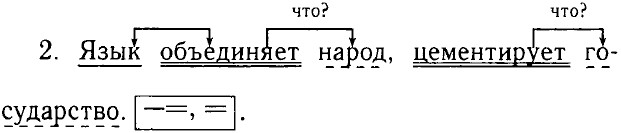 4. Простое, распространённое, неосложнённое. 5. Члены предложения: а) подлежащее — язык, сущ., неодуш., нариц., 2-е скл., м. р., ед. ч., им. п.; б) сказуемое — объединяет, цементирует, глаг., невозвр., изъяв, накл., I спр., 3-е л., ед. ч.; в) дополнение — народ (сущ., неодуш., нариц., мн. ч., в. п.), государство (сущ., неодуш., нариц., 2-е скл., ед. ч., в. п.). Упр. 161 — самостоятельно.